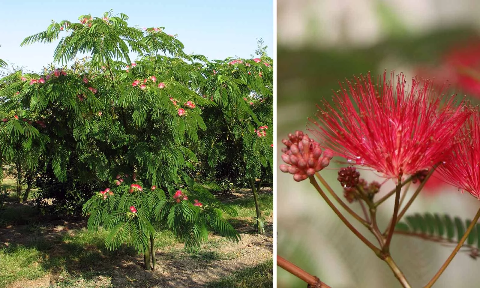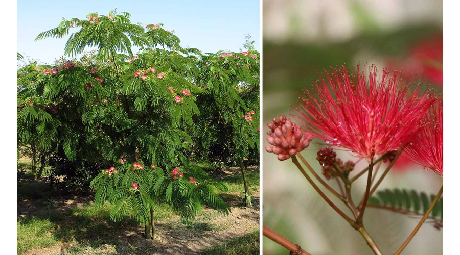 A selyemakác Irántól Japánig honosan megtalálható. Lomhullató, közepes méretű fa. Levele kétszeresen szárnyaltan összetett. Sötét rózsaszín porzószálakból álló borzas virágcsomói júniustól szeptemberig nyílnak. Már fiatal korában hozza különleges virágzatát. Lombozata és virágzata egzotikus látványt kölcsönöz. Koronaformája terebélyes, ernyős. Végmagassága 6-10 m.