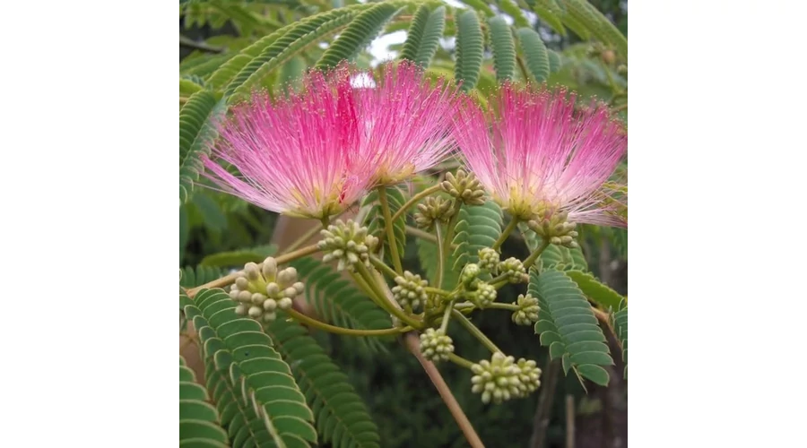 A selyemakác Irántól Japánig honosan megtalálható. Lomhullató, közepes méretű fa. Levele kétszeresen szárnyaltan összetett. Sötét rózsaszín porzószálakból álló borzas virágcsomói júniustól szeptemberig nyílnak. Már fiatal korában hozza különleges virágzatát. Lombozata és virágzata egzotikus látványt kölcsönöz. Koronaformája terebélyes, ernyős. Végmagassága 6-10 m.
