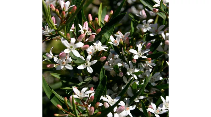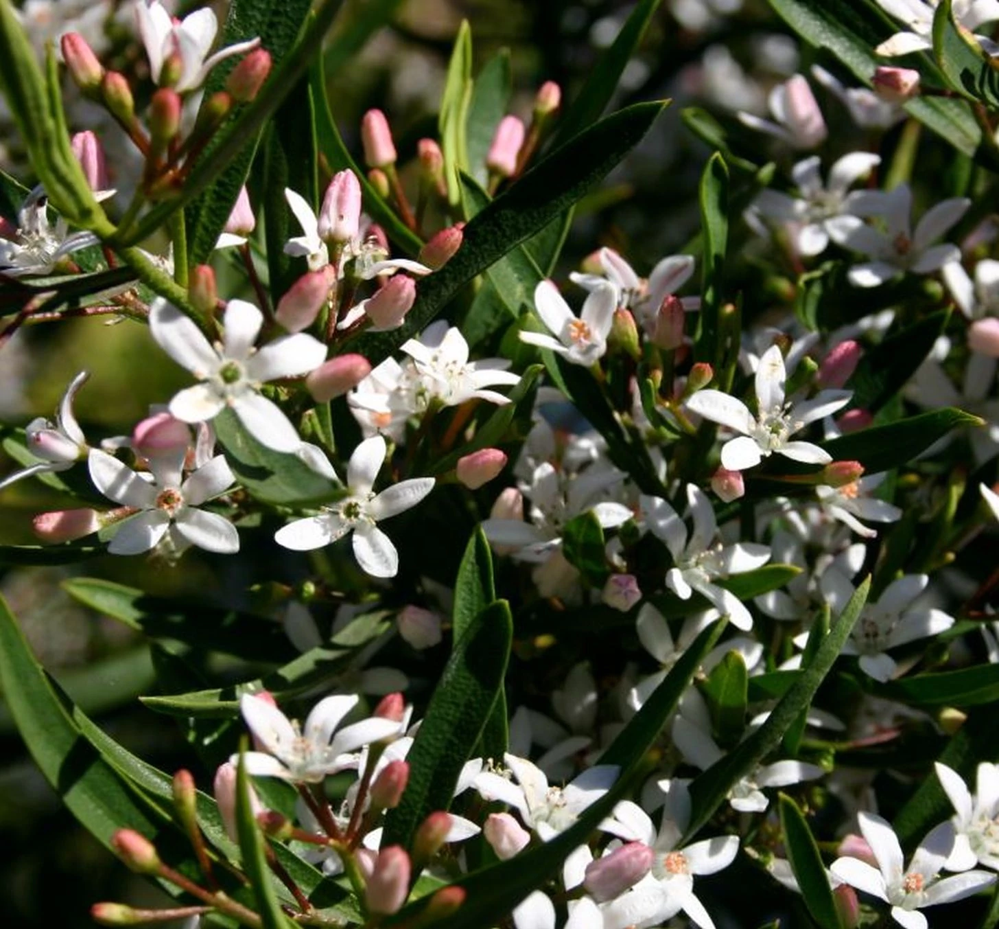 Ausztráliában őshonos, hosszúkás levelű, 2 méter körüli méretet elérő, kerekded, örökzöld cserje, mely megfelelő helyen tél végétől nyár elejéig nyitja ötszirmú, fehér virágait. A virágzás csúcspontján a bokrok a talajtól a csúcsukig fehér virágdíszbe öltöznek