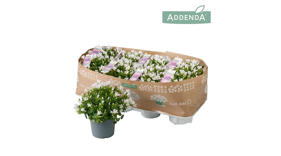 A Campanula Ambella White egy elegáns, tiszta fehér virágokkal díszítő harangvirág, amely letisztult és friss megjelenést kölcsönöz bármilyen térnek. Kompakt növekedése és bőséges virágzása miatt ideális balkonládába vagy cserépbe.