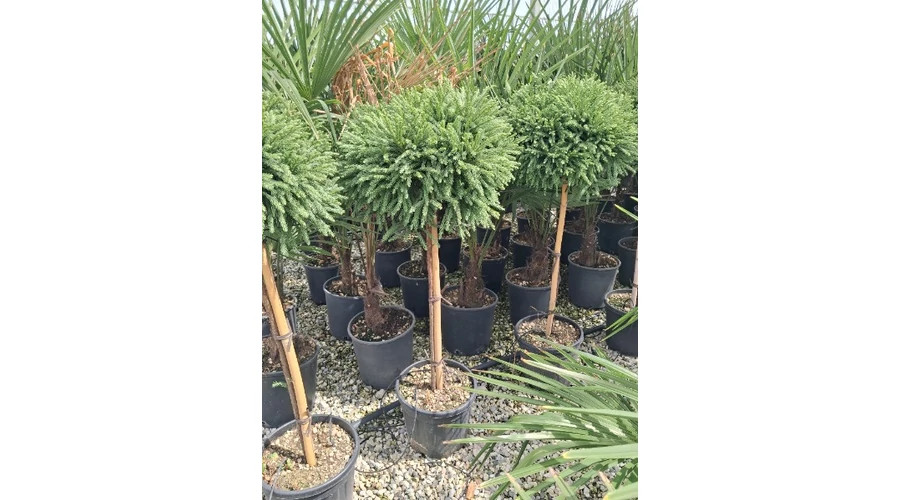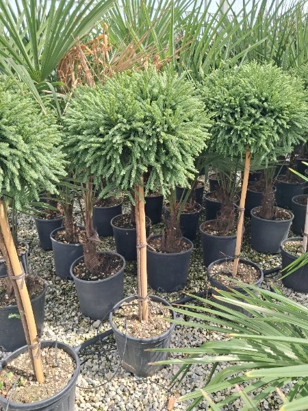 A Cryptomeria japonica 'Globosa Nana' törzses egy különleges, törzsre oltott örökzöld dísznövény, amely tökéletes gömb formájával és sűrű lombjával modern és elegáns megjelenést kölcsönöz kertednek vagy teraszodnak.