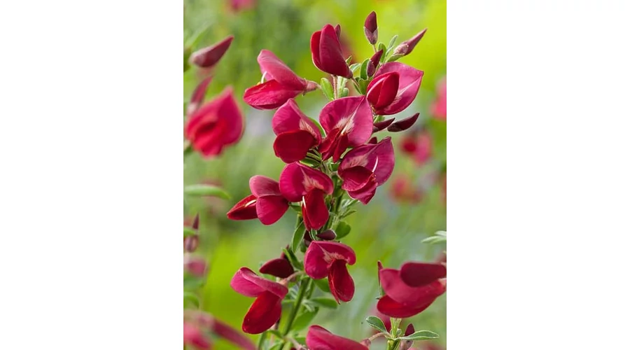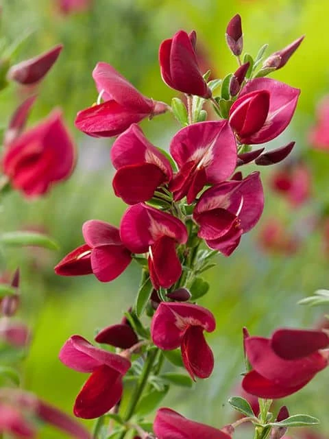 - Virágzat: Sötétpiros vagy rubinvörös, pillangós virágai vannak, amelyek májusban és júniusban sűrűn, nagy tömegben borítják el a vesszőket. Virágai enyhén illatosak.