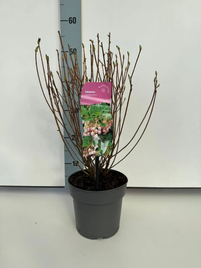 Az Enkianthus campanulatus lassú növekedésű, laza, finoman elágazó bokor. Kifejlett korában általában 1,8–2,5 méter magasra, de esetekben akár 5 méterre is megnőhet. Levelei középméretűek, tojásdad alakúak, tavasszal élénkzöldek, nyárra sötétebb tónusúak, ősszel élénk narancs-, vörös- és bordó árnyalatokra színeződnek. Szárai karcsúak, gyakran örvösen álló oldalágakkal, ami elegáns, ernyőszerű koronát eredményez. Virágai csüngő fürtökben jelennek meg; harang alakúak, krémszínűek vagy fehéres-rózsaszínes árnyalatúak, jellegzetes vörös erezettel és szegéllyel. A virágok nektárban gazdagok, vonzzák a méheket és pillangókat.