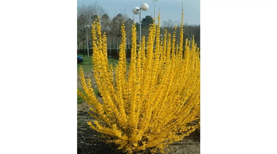 A 'Lynwood' (gyakran 'Lynwood Gold' néven említik) fajtát Észak-Írországban fedezték fel az 1950-es években, a 'Spectabilis' fajta egy mutációjaként. Erőteljes, gyors növekedésű, felfelé törő, majd kecsesen ívesen széthajló ágrendszerű, lombhullató díszcserje, amely a Weekend fajta után néhány nappal nyílik. Levelei közepes méretűek, lándzsásak, erősen fogazott szélűek, élénkzöldek, ősszel sárgára színeződhetnek. Szárai ívesen hajlanak, fiatalon zöldesek, idővel barnulnak, sűrű elágazásúak. Virágai nagy méretűek, harang alakúak, elszórtabban helyezkednek el a hosszú hajtásokon, illatuk enyhe. Termése apró, toktermés, amely nem jelentős díszértékű.