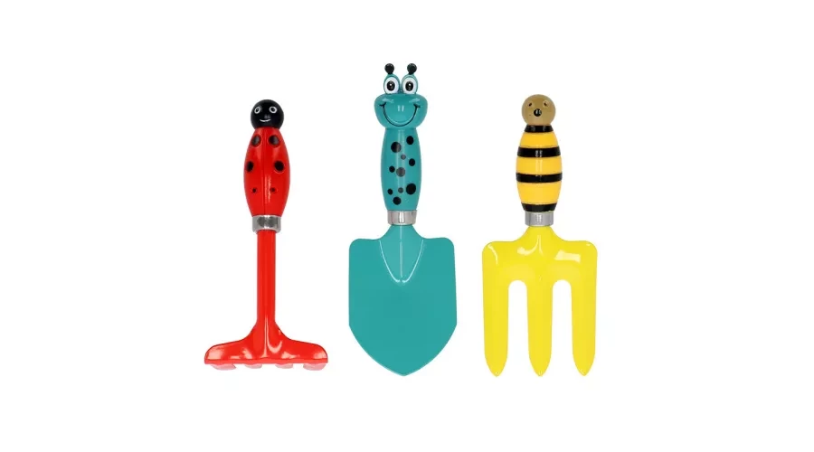 Gyerek kerti szerszám szett, katica, béka, méhecske markolattal. Három részes kerti eszköz szett, melyben a legfontosabb szerszámok most mókás külsőt öltöttek! A színes gereblye, kézi ásó és az ültetővilla a legkisebbeket is a kertbe csalogatja, és a játszótéren is biztosítják a vidám perceket! A gyerekméretű kerti szerszámok markolatának kialakítása kényelmes, biztos fogást biztosít a kis kezek számára.