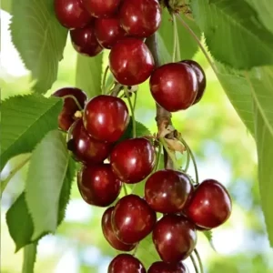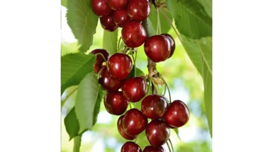Gyümölcse: Közép nagy, megnyúlt szív vagy tojás alakú. Héja sötétvörös, apró világos, piros pontokkal borított, majd éretten feketés-pirosra színeződik. Kocsánya hosszú. Sötét kárminpiros húsa félkemény, nem ropogós, íze kezdetben eléggé kesernyés, éretten édes-savanykás, fűszeres zamattal. Repedésre hajlamos.