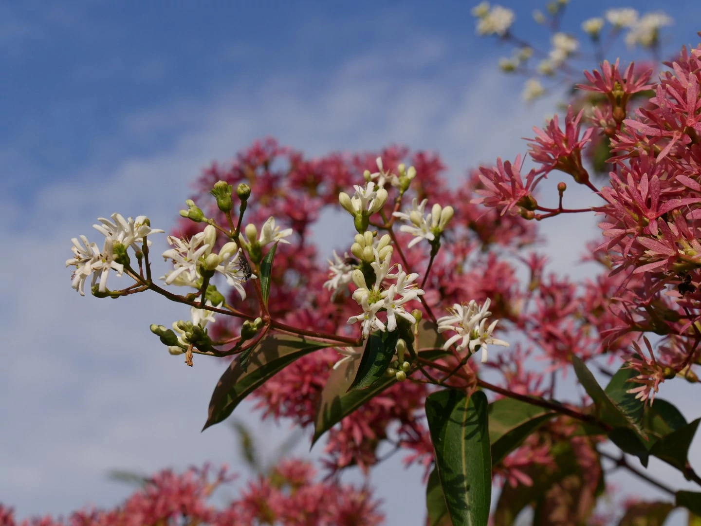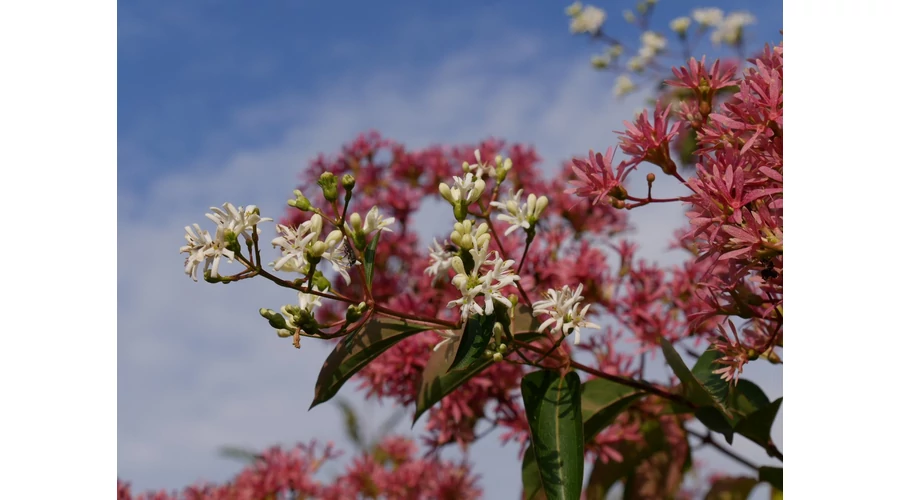 Virágszín: Krémfehér, a csészelevelek pirosas-bordó színűek