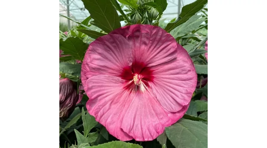 Formás bokrán, a lilás rózsaszín, 18-20 cm átmérőjű virágai, a haragoszöld, lilával árnyalt levelekkel a háttérben vonzzák a tekintetet.