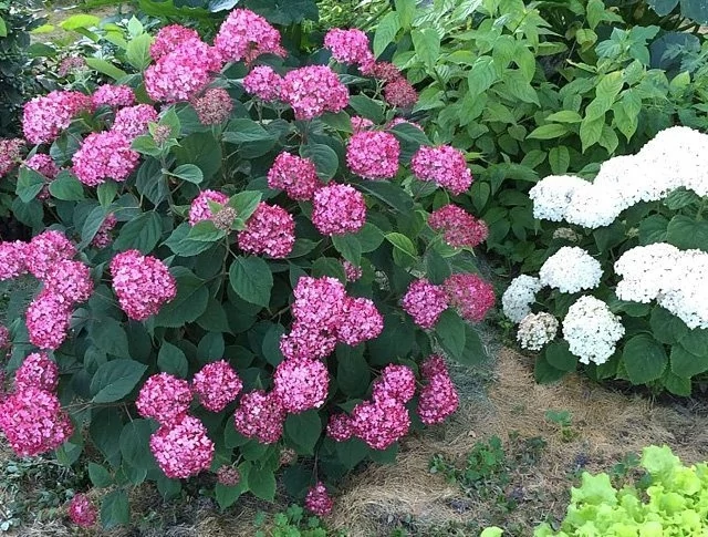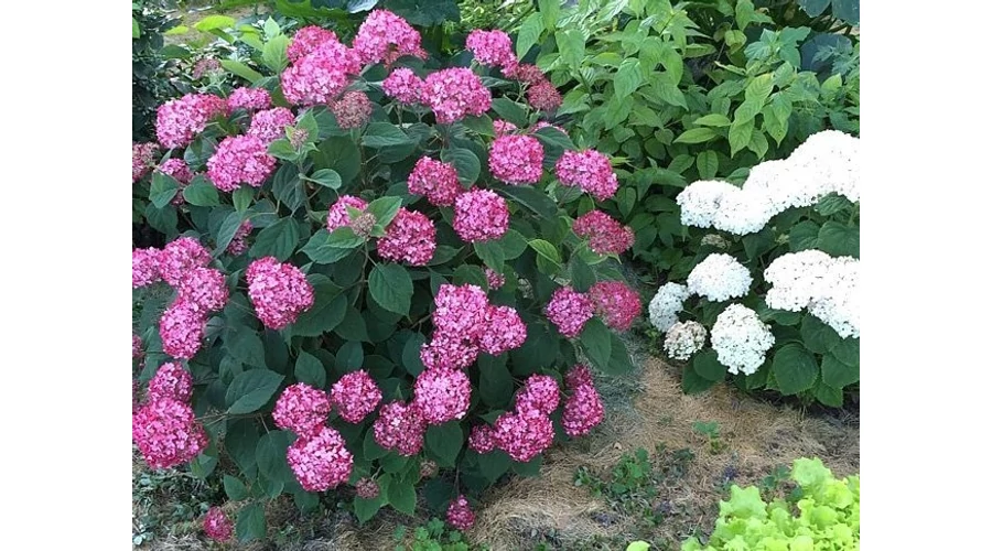 A Hydrangea ‘Ruby Annabelle’ kompakt, bokros növekedésű lombhullató cserje, amely a nyár folyamán folyamatosan fejleszti nagyméretű, gömb alakú virágait.