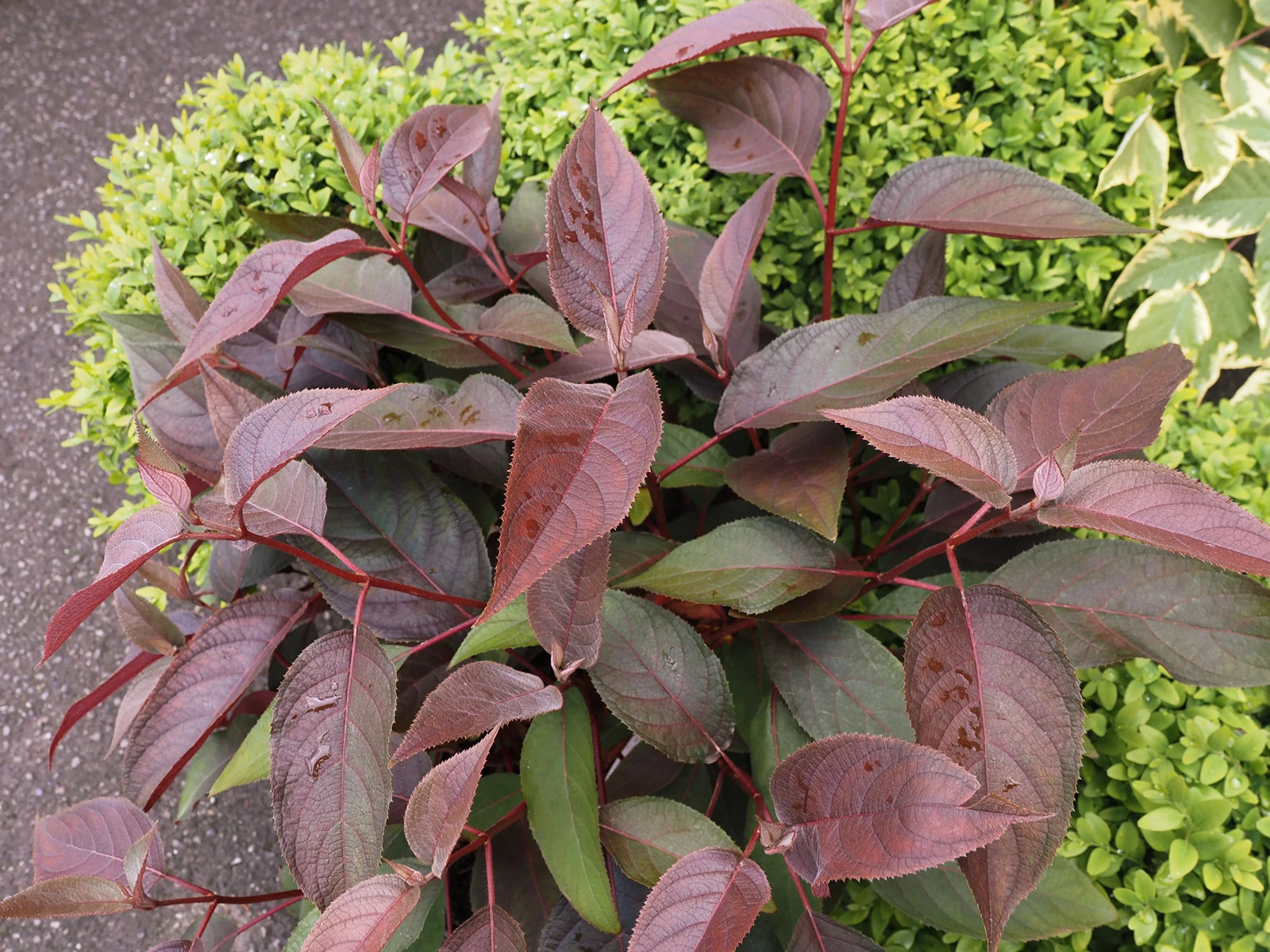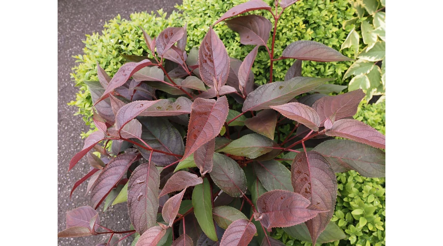 Felálló ágrendszerű, terebélyes bokrot nevelő, lombhullató cserje. Kifejlett magassága 2-3 méter. Levelei hosszúkás tojásdadok, csokoládébarnák, őszre zöldek lesznek, érdes-szőrös tapintásúak. Virágai végálló, szokatlan megjelenésű, kétszínű bugavirágzatokba tömörülnek. A középső termős virágok aprók, lila színűek, a külső körben elhelyezkedő steril virágok nagyobbak, négy szirmúak, rózsaszínes-fehérek. Június-július hónapban virágzik. A szokatlan színű levelek egy második meglepetést okoznak ősszel, mivel mélyzöldre fakulnak, mielőtt borostyánsárga és arany árnyalatúvá válnának.