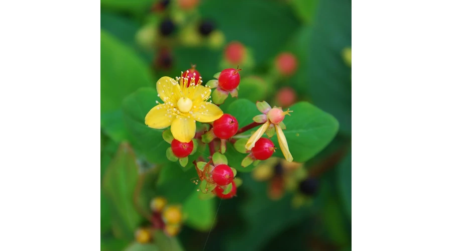 A 'Magical Marbles' (más néven 'Magical® Marbles') fajta a "Magical" sorozat része. A fajtát Peter A. Kolster nemesítette Kolster Faiskolában (Hollandia, Boskoop). A nemesítési program 1998-ban indult, ez a fajta a 2000-es évek közepén jelent meg. Keresztezéses nemesítéssel (hibridizációval) hozták létre névtelen magoncokból, kifejezetten a rozsdagombával szembeni ellenálló képesség és a különleges bogyószínek elérése érdekében. Kompakt, bokros, sűrű növekedésű, hosszan virágzó lombhullató díszcserje. Sűrű, sötétzöld, olykor kékeszöld levelei vannak, amelyek dörzsölésre illatosak. A levelek és a szárak gyakran vöröses-lila vagy bronzos árnyalatot kapnak, ami különleges hátteret ad a virágoknak. Június végétől októberig folyamatosan hozza 2-3 cm széles, élénk aranysárga virágait, amelyek közepén látványos porzócsomó található. A virágok után fejlődnek ki a húsos, fényes, lénk, cseresznyepiros bogyók, melyek őszre feketére érnek.