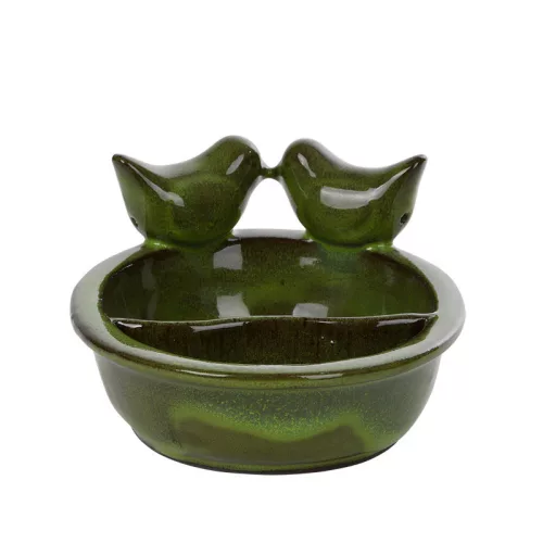 Kerámia madáretető- és itató madárdíszítéssel, zöld színben. Ha szeretnél kedvükben járni a madaraknak, remek választás ez a kerti kiegészítő! A két részre osztott kerámia tál egyszerre funkcionálhat madáretetőként, madáritatóként és madárfürdőként, mindamellett dekoratív tartozéka lehet minden madárbarát kertnek! Tartós, természetes anyagával, a csillogó zöld mázzal remekül mutat szabadtéren a növények közt. Tippünk: a utántöltés mellett ne feledkezz meg a madáretető rendszeres tisztításáról sem! Az etető tisztítása különösen nedves időben fontos, így megelőzhető a betegségek terjedése a madarak között. Ha szívesen hallgatod a madárcsicsergést, és szeretnéd őket megfigyelni otthonod közelében, remek választás lesz ez a többfunkciós kerti madáretető! Hideg időjárás esetén nem ajánlott a terméket a szabadban hagyni, mivel a fagy okozhat sérülést vagy repedést a kerámia felületén.