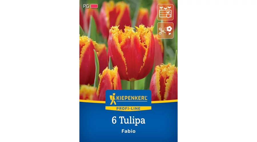 Sárga-narancssárga szegélyekkel szegélyezett, tüzes vörös szirmaival a rojtos 'Fabio' tulipán igazi tekintetgyönyörködtető. Ez a Crispa tulipán nemcsak megjelenésével, hanem fantasztikus minőségével is lenyűgöző. A 'Fabio' télálló, áprilisban virágzik, és körülbelül 45 cm magasra nő. Vágott virágként is tavaszi boldogsággal tölti meg az életterét.
