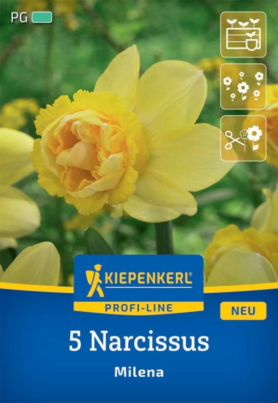 A dupla nárcisz 'Milena' (Narcissus x hybrida) kivételes szépségű. Virágai finom sárga színűek, aranysárga közepűek. A trombitavirág sűrűn telt virágzatú, és rózsavirágra hasonlít. Világossárga szirmai enyhén visszahajlanak, amitől a virág még nagyobbnak tűnik. Körülbelül 35 cm magas 'Milena' nárcisz ideális ágyásokba, ültetőkbe és ablakládákba, és szépen kombinálható világoskék szőlőjácintokkal és balkáni szellőrózsákkal. A 'Milena' a napos, széltől és esőtől védett helyeket kedveli, mivel a nehéz virágok különben a földhöz préselődnének.