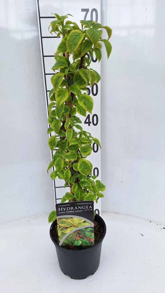A Hydrangea anomala ‘Golden Touch’ PBR a kúszó hortenzia egy modern, díszlombú változata. Tapadó gyökereivel képes önállóan kapaszkodni, így külön támaszték nélkül is felkúszik függőleges felületekre.