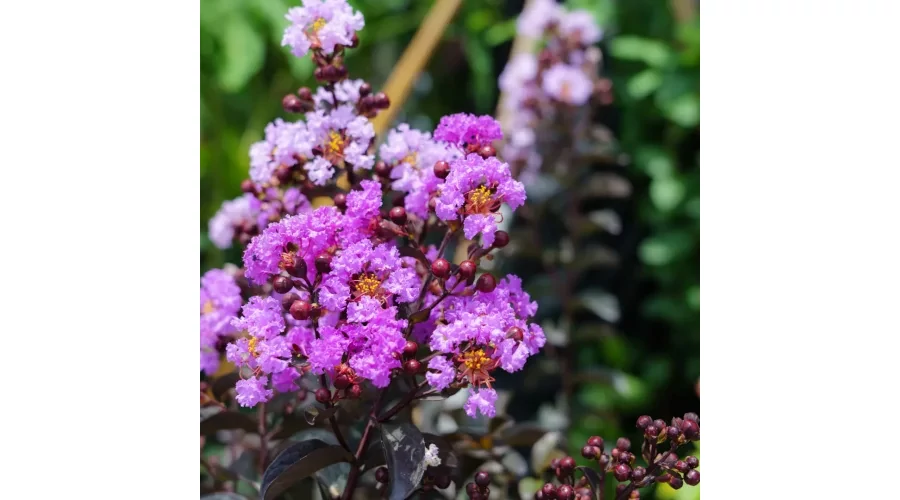 A Lagerstroemia indica 'Purely Purple' (Black Diamond® sorozat) fajtát az Egyesült Államokban nemesítették. Az ausztrál nemesítő, Jim Berry és az amerikai Michael A. Dirr professzor (Georgia Egyetem) nevéhez fűződik a sorozat kifejlesztése. A 'Purely Purple' ('JA928') a Black Diamond® kollekció egyik kulcsfajtája. A nemesítési munka az Egyesült Államokban, Floridában és Georgiában zajlott, a J. Berry Nursery és a University of Georgia együttműködésében. A nemesítés a 2000-es években kezdődött, a fajtát 2012 körül szabadalmaztatták, és 2014-ben mutatták be a nagyközönségnek.Kompakt, sűrű, felálló növekedésű fajta. Tavasszal a kihajtó levelek bronzos-rézszínű árnyalattal jelennek meg, amelyek gyorsan átmennek a fajtára jellemző, fényes, mély bordó-fekete színbe, amely őszre még sötétebbé válik. Ez a sötét lombozat kiváló hátteret biztosít a vele összeültetett növények számára. A levelek lehullása után a növény sima, hámló kérge válik láthatóvá, amely a szürkétől a rubinvörös árnyalatokig terjedő foltokban tarka, így télen is csodaszép látványt nyújt. A virágok nagy, kúpos bugákban nyílnak, színük élénk, vibráló ametiszt-lila vagy mályva-lila. Nagyon bőségesen virágzik.