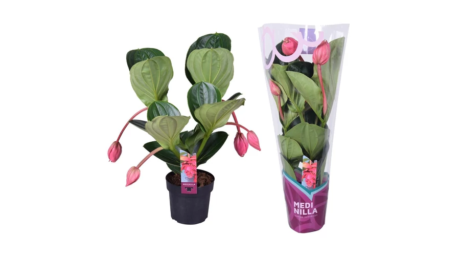 A Flamenco medinilla egy különleges dísznövény, amely elegáns, lecsüngő virágfürtjeivel az egyik legimpozánsabb szobanövény. A nagy, rózsaszín virágok egzotikus hangulatot teremtenek bármely enteriőrben.