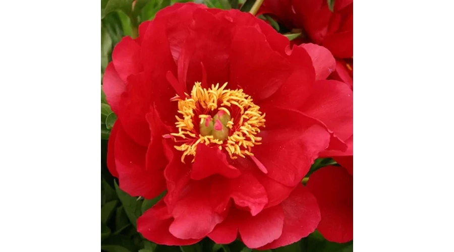 Virág: nagy, kb. 15 cm átmérőjű, csésze formájú, édes illatú, szimpla vagy féltelt, fényes, cseresznyepiros szirmú, feltűnő, aranysárga porzójú virágait május-júniusban gazdagon hozza.