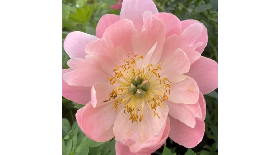 Virág: nagy, féltelt, selymes szirmú, erős illatú, kezdetben korallrózsaszín, majd őszibarack színű, látványos, sárga porzójú virágait május-júniusban hozza.