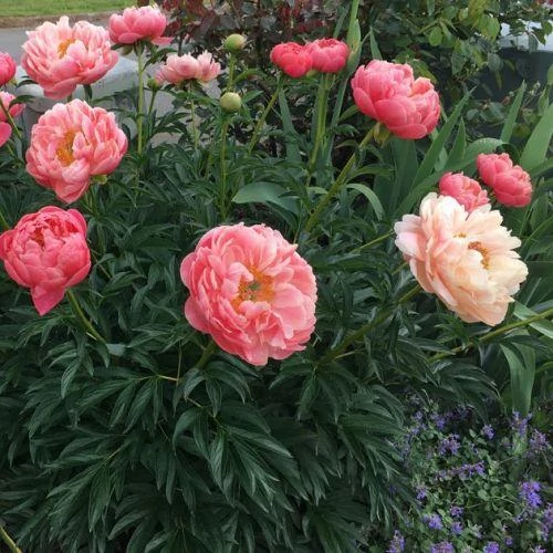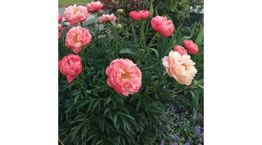 A díjnyertes Paeonia lactiflora ‘Coral Sunset’ – lágyszárú bazsarózsa féldupla virágai eleinte rózsaszínűek, de szép lassan tört fehérré halványodnak.