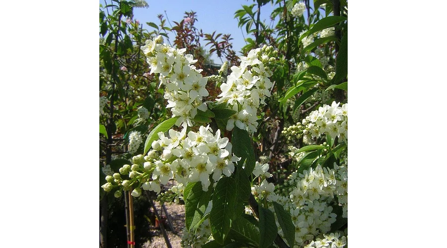 Virág: Áprilisban és májusban bontja fehér, szimpla, erősen illatos, 5 szirmú virágait, melyek fürtökbe tömörülnek. Korai virágzású.