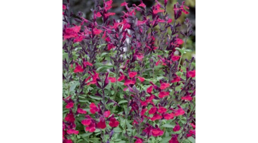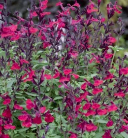 Salvia greggii ‘Mirage Burgundy’ – őszi zsálya nevével ellentétben korai virágzású, akár június elejétől nyílhatnak kicsi, kétajkú vörös virágai.