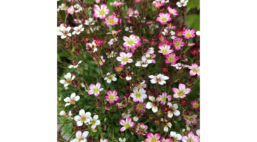 Saxifraga x arendsii ‘Pixie Rose’ – mohalevelű kőtörőfű kb. 10 cm magas, virágai sötétrózsaszínűek.