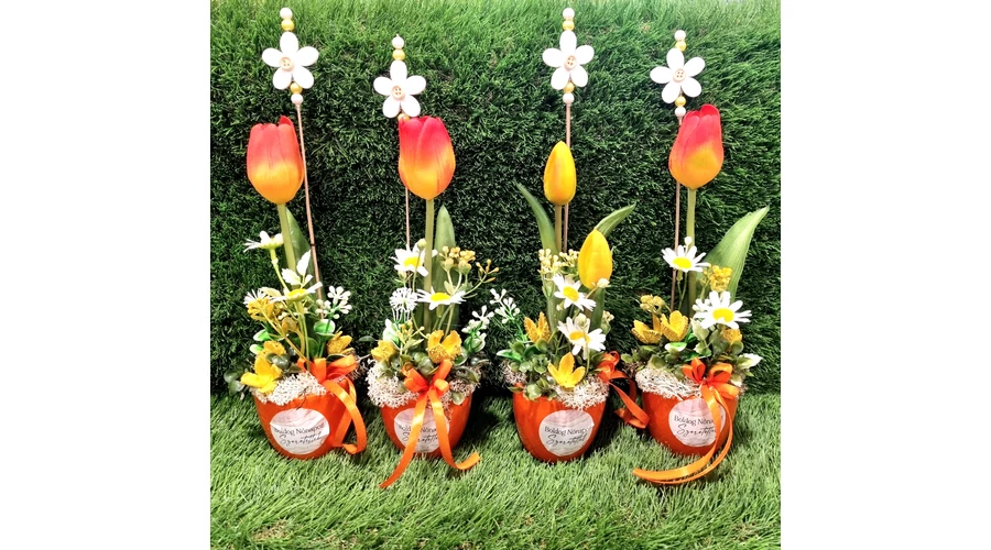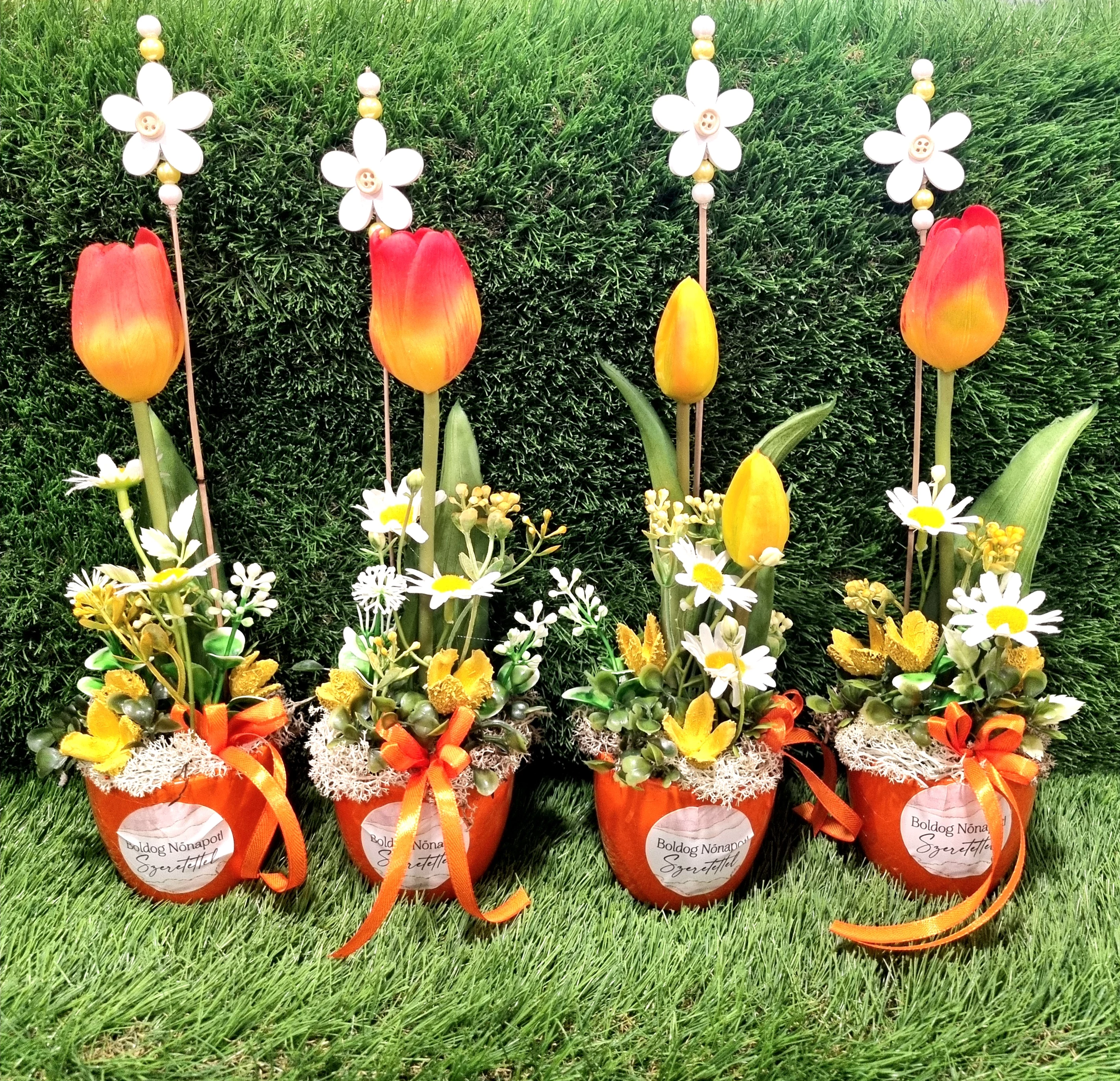 Tavaszi asztaldísz nőnapra narancs kaspóban
