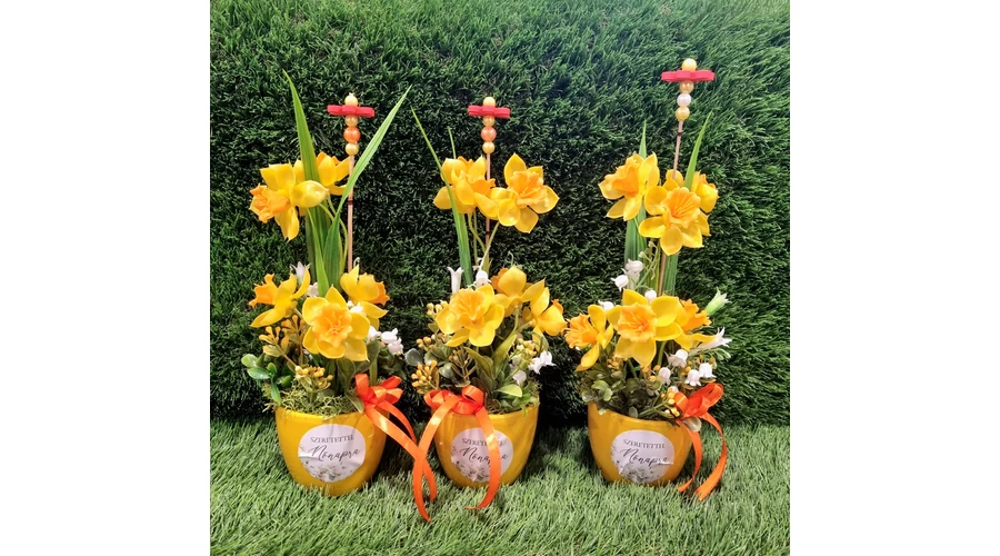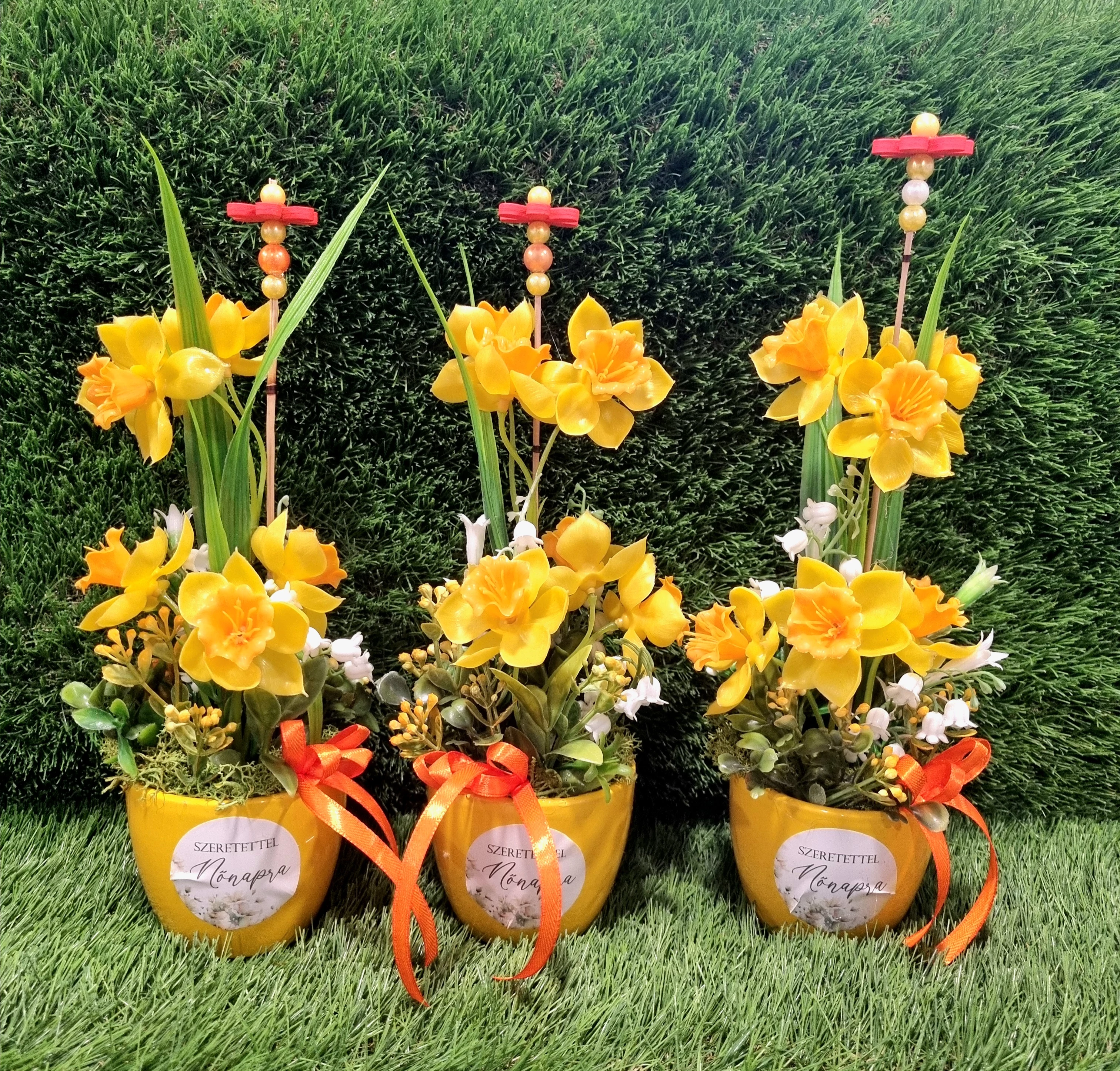 Tavaszi selyemdísz nőnapra sárga kaspóban