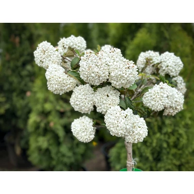 A 'Eskimo' fajtát az Egyesült Államok Nemzeti Arborétumában (U.S. National Arboretum) nemesítették, és 1981-ben hozták forgalomba. Egy keresztezés eredménye, amely a Viburnum × carlcephalum 'Cayuga' és a Viburnum utile tulajdonságait ötvözi, így egyesíti a hólabda virágzatot a törpe növekedési habitussal és a félörökzöld lombozattal. Sűrű ágrendszerű, lassan növő, kompakt, félörökzöld cserje. Levelei tojásdadok, fényes sötétzöldek, enyhén bőrneműek, enyhe télen a növényen maradhatnak, de keményebb fagyok hatására lehullik. Hajtásai felállók, később enyhén ívesen kihajlók. Nagyméretű, sűrű, gömb alakú (hólabda) virágzatok, amelyek bimbóban enyhe rózsaszín árnyalatúak, majd kinyílva tiszta fehérré válnak, és finom illatot árasztanak. A virágok bőségesen nyílnak. Termése ritkán fejlődik, kis méretű, sötét színű bogyó.