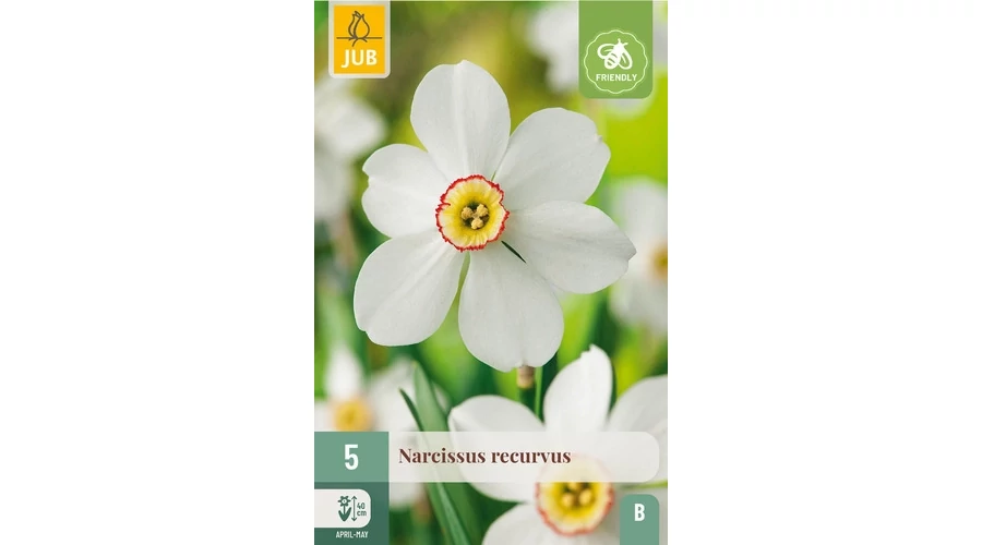 A gyönyörű, visszafogott Narcissus recurvus fehér szirmokkal és apró sárga koronával rendelkezik, narancssárga szegéllyel.
